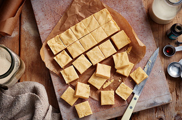 6. Выложите готовую массу на подготовленный противень, разровняв поверхность, и дайте ей остыть при комнатной температуре в течение 1 часа. Затем осторожно переверните на доску и нарежьте на квадратные порции — получится около 25 штук.