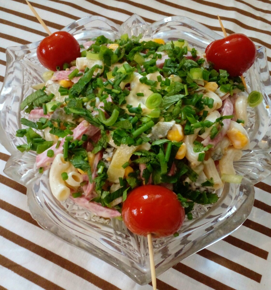 Для финального штриха посыпаем готовое блюдо свежей зеленью и добавляем немного консервированных томатов черри для цвета и вкуса.