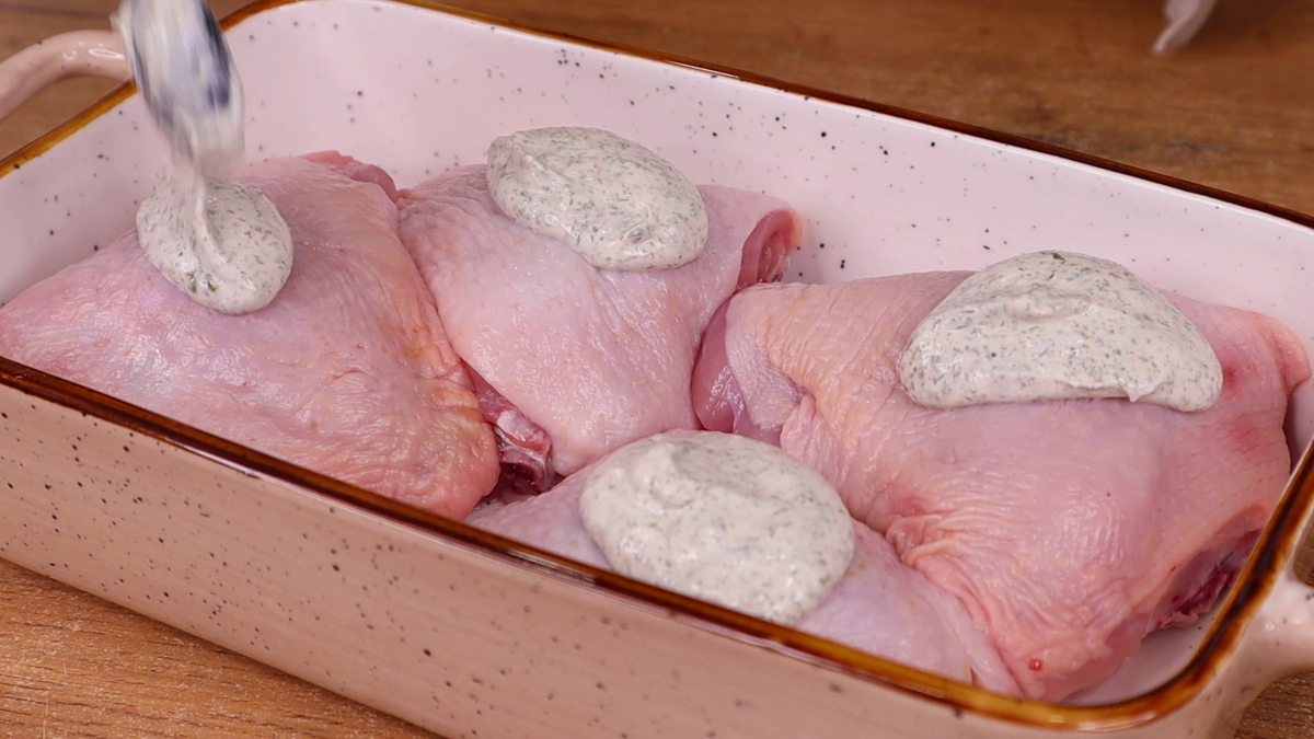 Заранее разогрейте духовку до 200 градусов. В это время следует подготовить форму для запекания: её нужно смазать растительным маслом. Затем укладываем куриные бедрышки и обильно смазываем их сметанным соусом, чтобы обеспечить насыщенный вкус.