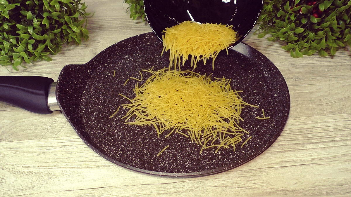 Первый шаг — обжарить вермишель. Это должно сделать любой, кто хочет добиться идеального результата. На сухой сковороде вермишель следует обжаривать до красивого золотистого цвета. Важно следить за процессом, поскольку это займет всего пару минут, а затем выкладывать её в миску, чтобы остановить процесс приготовления.