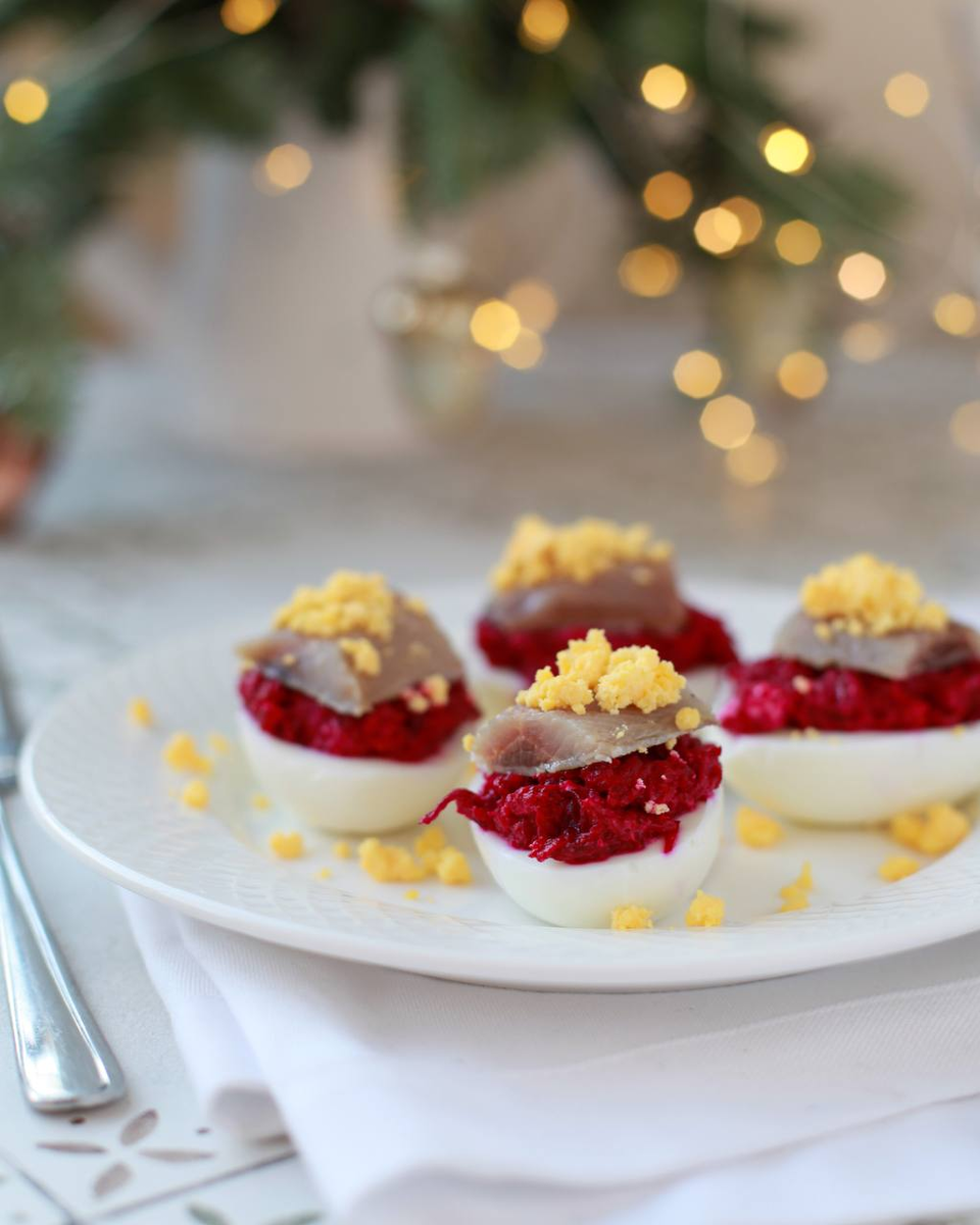 Яйца отвариваются, очищаются и разрезаются пополам; желтки аккуратно удаляются.Желтки необходимо размять до однородной массы с помощью вилки.Рыбу освобождают от кожи и нарезают небольшими кусочками.Лук мелко рубится, а свёкла натирается на терке с мелкими ячейками.Смешиваются натёртая свёкла, лук и майонез, при этом смесь стоит немного посолить.Полученная свекольная масса заполняет половинки яиц, сверху укладываются кусочки рыбы.Перед подачей блюдо посыпается крошкой из желтков.Совет: Наполняйте яйца начинкой непосредственно перед подачей, чтобы избежать слишком интенсивного окрашивания.