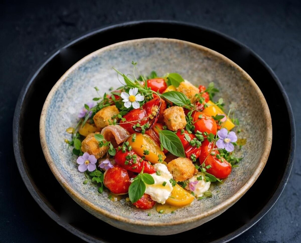 Этот яркий и свежий салат сочетает в себе насыщенный вкус сочных помидоров, хрустящих гренок и кремообразного сливочного сыра, создавая идеальное блюдо для любого сезона.