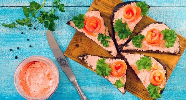 - Сделать на бутерброде симпатичные розочки из свёрнутых ломтиков слабосолёного лосося и украсить свежей петрушкой.