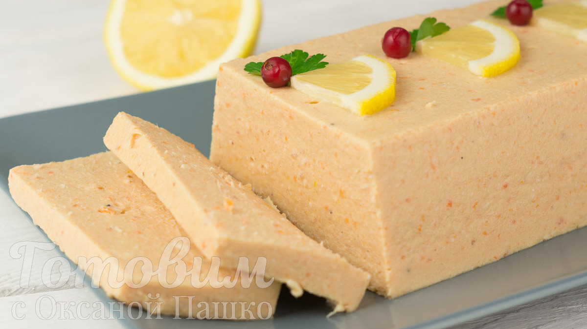 9. После застывания вынуть паштет из формы, украсить лимоном и зеленью.