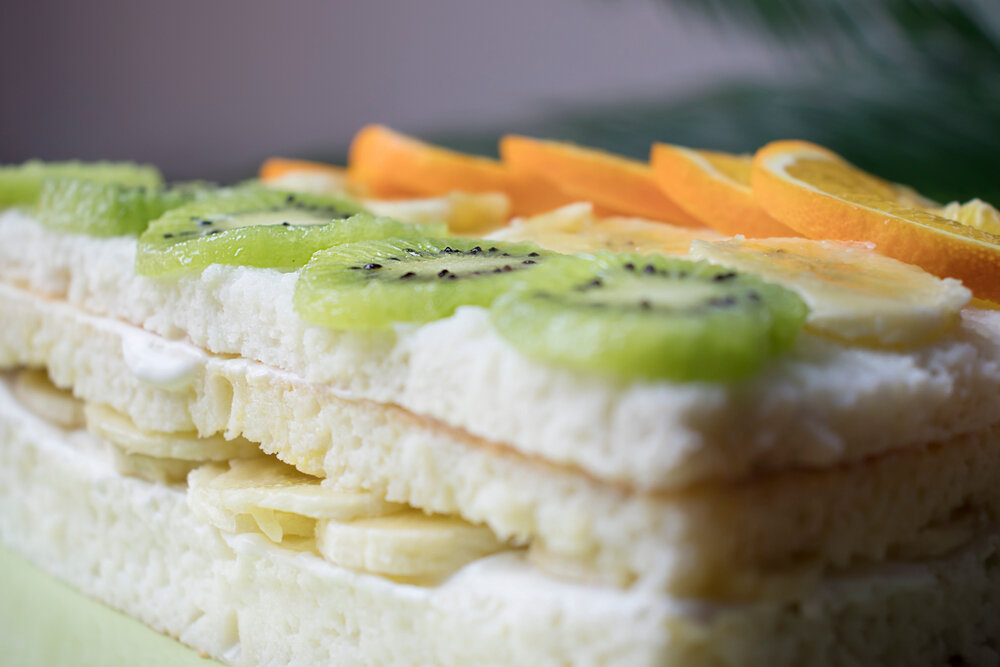 - Сборка торта: Разрежьте остывший бисквит на две части, обильно смазав каждую кремом. Выложите на одну часть нарезанные фрукты, накройте второй частью и украсьте сверху оставшимися фруктами.