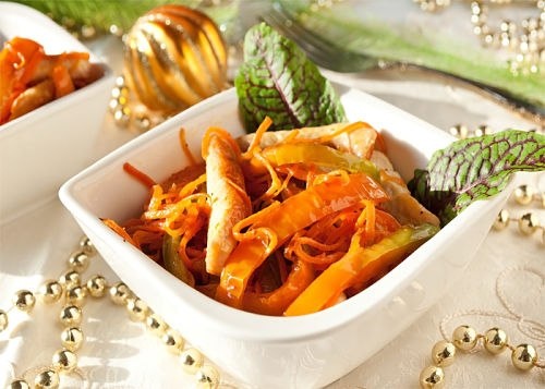Этот салат стал популярен благодаря своей легкости в приготовлении. Мясо курицы, сочный сладкий перец и ароматная корейская морковь создают неповторимую гармонию вкусов. Болгарский перец лучше выбирать мясистый, желательно разнообразного цвета: он не только украсит блюдо, но и добавит новые оттенки вкуса. Если нет времени, можно приобрести готовую корейскую морковь, но её легко приготовить и самостоятельно.