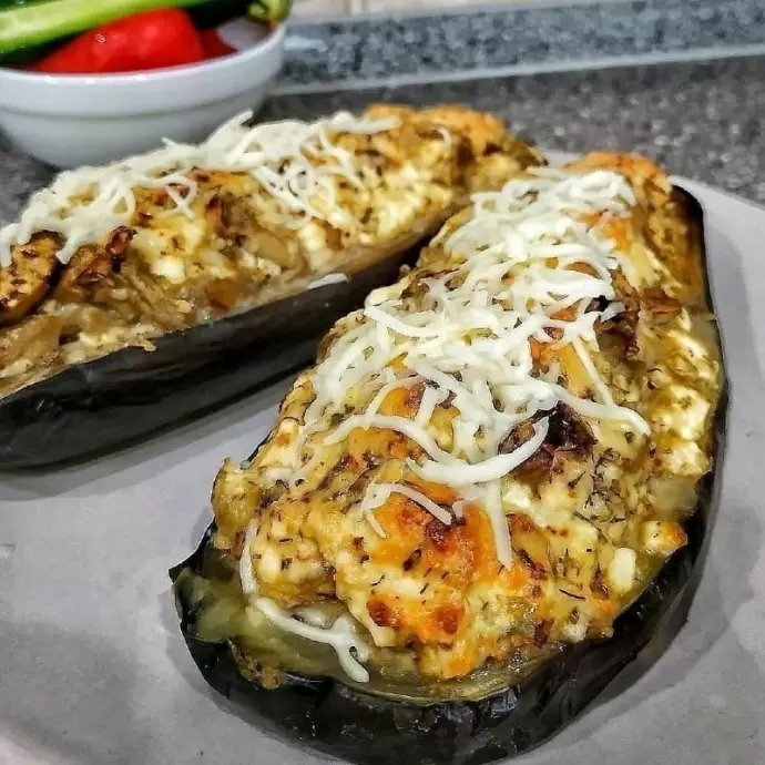 С помощью ложки заполняем баклажан подготовленной начинкой, сверху посыпаем оставшимся сыром.