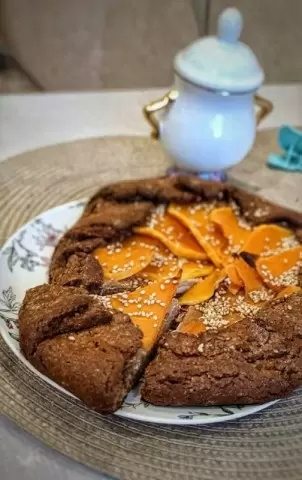 Раскатайте тесто в круг размером примерно 28-30 см и перенесите его на смазанный маслом пергамент. Выложите тофу-пасту, оставляя отступ около 3-4 см от краев. На начинку положите тыкву и/или груши, заверните края галеты. Смажьте края и начинку сиропом топинамбура, посыпьте миндальными лепестками, кунжутом или орехами. Выпекать в разогретой до 180°С духовке 25-30 минут.