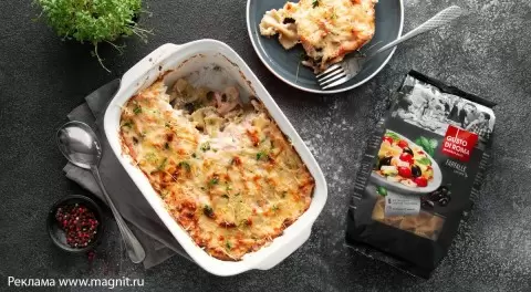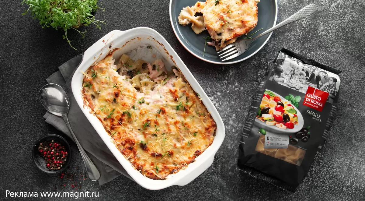 Запечённая паста с грибами и ветчиной является настоящим кулинарным сокровищем, похожим на греческое пастиццио. Нежный соус бешамель придаёт блюду особую мягкость, а сочетание ветчины и грибов делает его достаточно сытным.