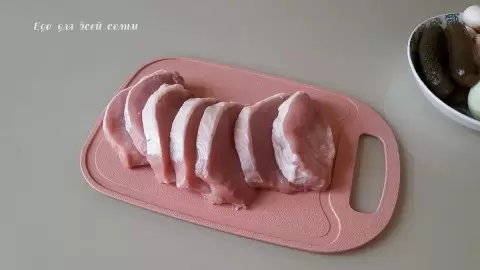 Сначала свинину нарезают на медальоны толщиной 8-10 мм. Шампиньоны стоит порезать на средние кусочки. Лук и маринованные огурцы натираются на крупной терке, создавая основу для начинки.
