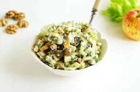 Приготовление этого салата не займет много времени. Сначала следует нарезать яблоко и стебли сельдерея. Далее добавьте грецкие орехи, изюм и свежий укроп. Заправку можно сделать, смешав греческий йогурт с лимонным соком. Все ингредиенты тщательно перемешиваются, и салат готов к подаче!