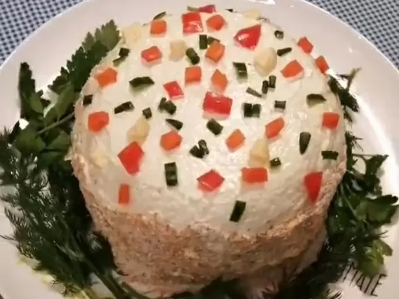 Готовим начинку из сметаны и майонеза для украшения. Достаем салат, аккуратно переворачиваем его на тарелку и снимаем пленку. Обмазываем бока и верх улучшенной смесью, обсыпая панировочными сухарями - это создаст иллюзию румяного теста. В заключение, украшаем верхние части нарезанными кусочками моркови, болгарского перца и помидоров, чтобы завершить этот кулинарный шедевр.