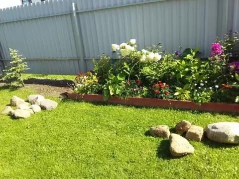 Помогая старшему сыну, хозяйка вместе с мужем загрузила в багажник множество валунов, которые разместили вместо старых досок. Необходимые материалы были собраны в несколько заездов, а существующие доски переработаны на дрова. Теперь клумбы выглядят более натуральными и гармонирующими с окружающей природой.