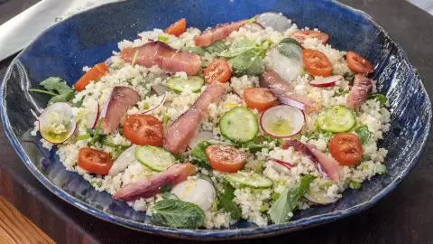 Кускус — основа, сочная горбуша — акцент, редис и огурец дают свежесть, а помидоры черри и зелень завершают композицию. Влажность и текстуру выдерживает лёгкая подсыпка соли, перца и чеснока, плюс масло и лимон придают блюду законченный характер.