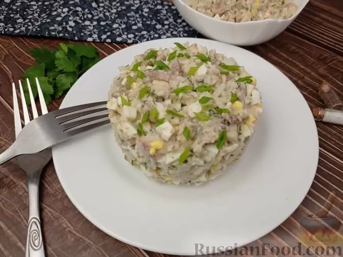 - Салат с рыбой и рисом – отличный выбор для праздничного стола. Комбинируя консервированную рыбу с отварным рисом и яйцами, вкус салата становится по-настоящему нежным. С добавлением зелени укропа блюдо обретает свежесть и аромат.