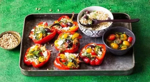 7. Заполнить теплые перцы начинкой из булгура, сверху выложить помидоры с базиликом. Подавайте блюдо немедленно, наслаждаясь вкусом греческого лета!