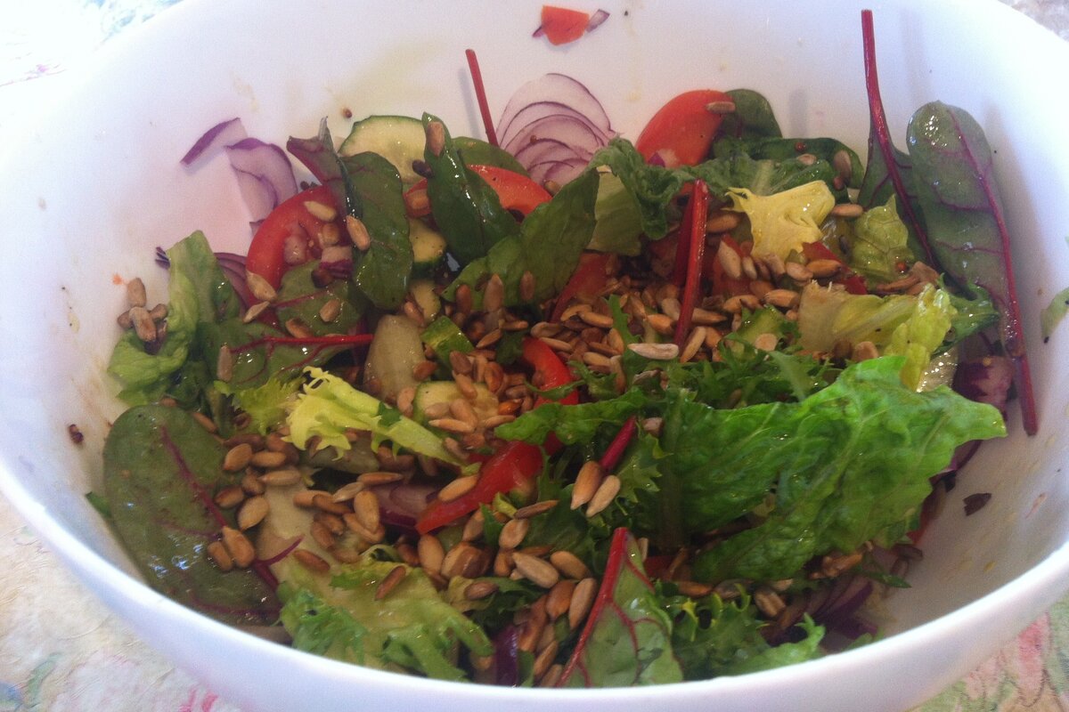 На раскаленной сковороде обжарьте семечки подсолнуха в течение двух-трех минут до золотистой корочки. Затем переложите их на тарелку, чтобы остыли.Нарежьте помидоры и свежий огурец крупными кусками, порвите листья салата, а лук — полукольцами.Соленые огурцы и авокадо нарежьте мелко, добавив их в общую массу.Для заправки в небольшой банке комбинируйте оливковое масло, бальзамический уксус, горчицу, соль и перец. Закройте крышку и хорошенько встряхните.Смешайте все подготовленные овощи с листьями салата и заправкой.Посыпьте готовый салат обжаренными семечками перед подачей на стол.