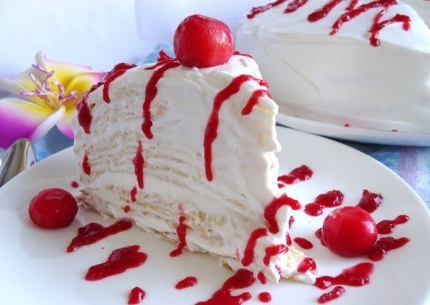 При подаче просто полейте охлажденный блинный торт вишневым соусом, который добавит особый фруктовый привкус и сделает десерт ещё более изысканным. Приятного аппетита!