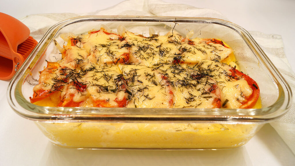 На подготовленный слой поленты выкладываются кружочки помидоров, после чего все щедро присыпается натертым сыром и зеленью. Запеканка отправляется в предварительно разогретую до 180° духовку и готовится на протяжении 20-25 минут до золотистой корочки.