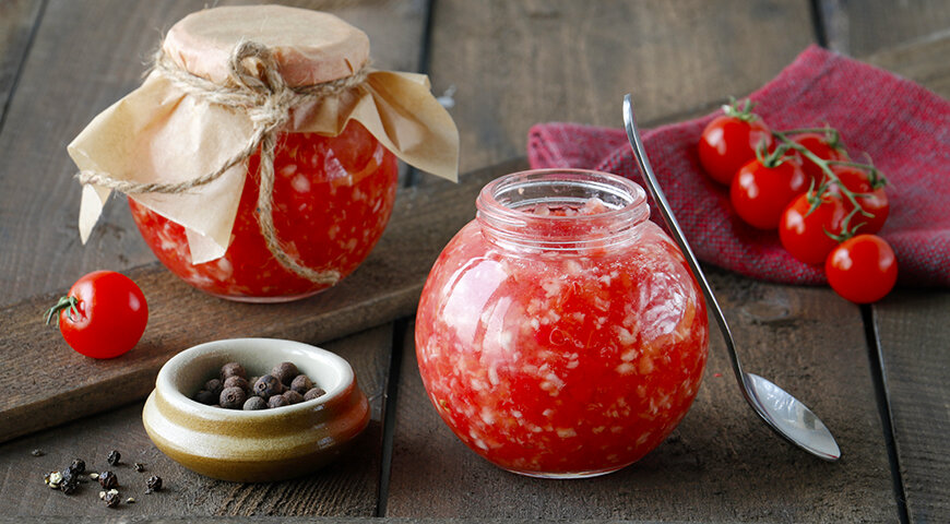 Подготовка помидоров: Разрезать помидоры на четвертинки и удалить семена и жидкость. Посолить их слегка и поместить в дуршлаг, чтобы отцеживалась лишняя влага.Очистка чеснока и хрена: Очищаем чеснок и очищаем хрен от кожицы, нарезая его средними кусочками.Измельчение ингредиентов: Если используется мясорубка, сначала пропустить чеснок, затем хрен, потом помидоры. При использовании кухонного комбайна, добавлять все ингредиенты порциями. Получите однородный соус с мелкими частицами.Приправляем солью: Для этого необходимо смешать соль с 4–5 столовыми ложками хреновины, дождаться растворения соли, а затем добавить этот раствор в основную массу соуса.Финальный этап: Стерилизовать банки или бутылки, разлить приготовленную хреновину, закрыть и оставить при комнатной температуре на 1 час. Затем поместить в холодильник для хранения.