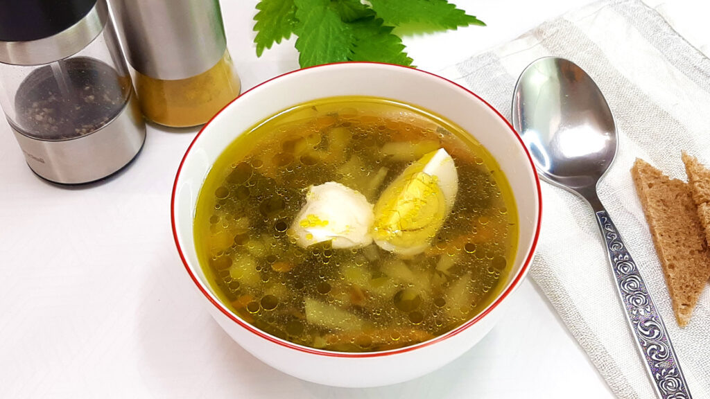 Можно добавить зелень и в конце варки, но тогда супу потребуется настояться около 30 минут для раскрытия всех вкусов. Суп варят на медленном огне до мягкости картофеля, что занимает, в среднем, около 15 минут. Количество зелени регулируется по вкусу — обычно добавляют горсть нарезанной травы. Перед подачей в готовый суп кладут вареное яйцо и немного сметаны. Приятного аппетита!
