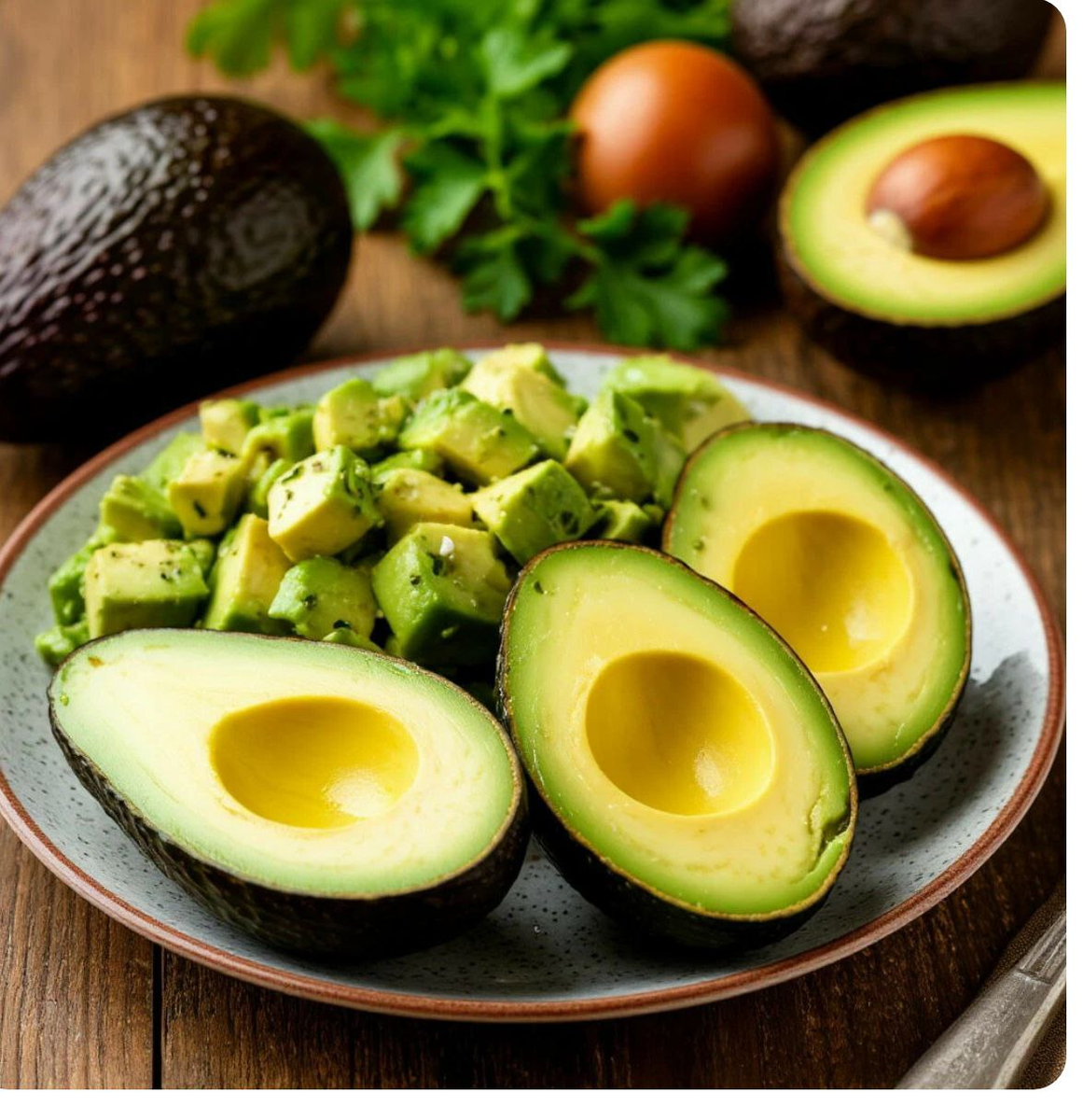 - Питательные жиры: Авокадо славится содержанием мононенасыщенных жиров, прежде всего олеиновой кислоты, которая положительно влияет на здоровье сердца, понижая уровень вредного холестерина и повышая «хороший».