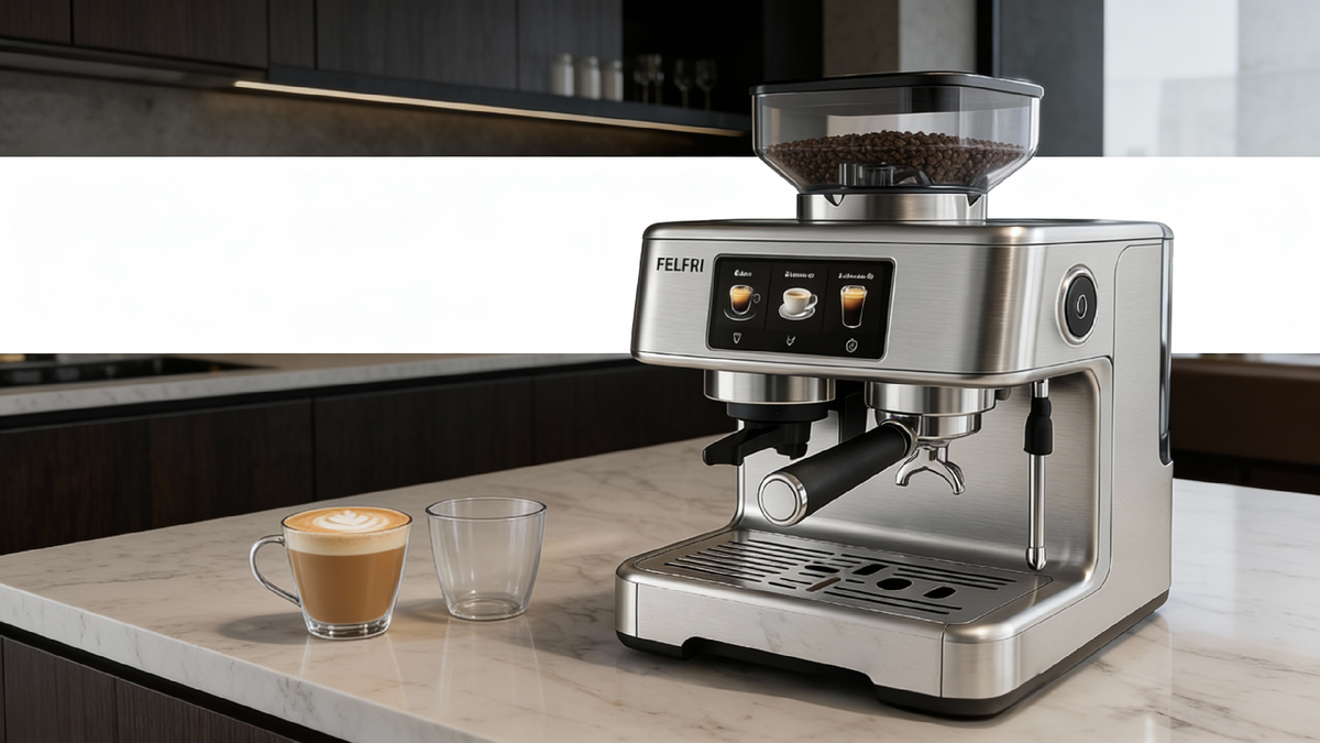 Модель FELFRI Gourmet FCM-005 сочетает в себе профессиональные характеристики и компактность для домашнего использования. Она оснащена стальным и алюминиевым корпусом, итальянской помпой ULKA и двумя термоблоками для стабильной температуры. Присутствует настройка помола в 25 степеней и ЖК-дисплей для контроля температуры, времени и объема. Кроме того, кофемашина включает подогрев чашек и полный комплект для бариста, что делает ее идеальным выбором для любителей качественного кофе.