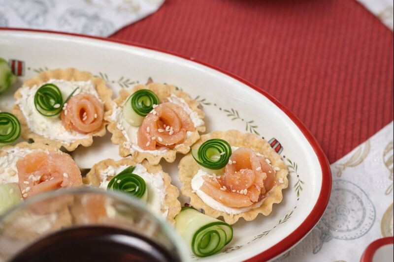 Некоторые закуски, такие как тарталетки, мгновенно исчезли с новогоднего стола. Их популярность объясняется разнообразием начинок: с красной рыбой и творожным сыром или с креветками и пастой. Эти маленькие угощения были быстро съедены благодаря простому и привлекательному оформлению, когда массу из яиц, крабовых палочек, сыра и майонеза уложили в тарталетки с помощью кондитерского мешка.