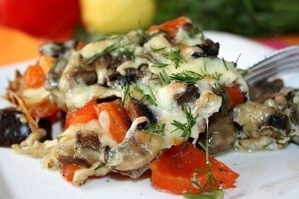 Для запекания подходит форма, в которую сначала выкладывают баклажаны, слегка присаливают и поперчают. Вторым слоем идут перцы — их также нужно немного приправить. Затем выкладываются грибы. Если их не солили во время обжаривания, стоит это сделать сейчас.