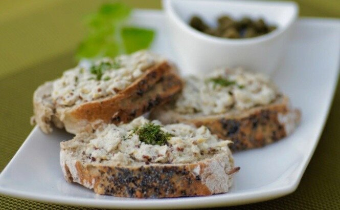 Рыбу следует размять вилкой вместе с жидкостью, а также добавить нарезанный лук, чернослив и укроп. Не забудьте заправить смесь сливочным сыром, хреном и лимонным соком. Настоять риет в холодильнике пару часов, а подавать его можно с гренками или овощами.