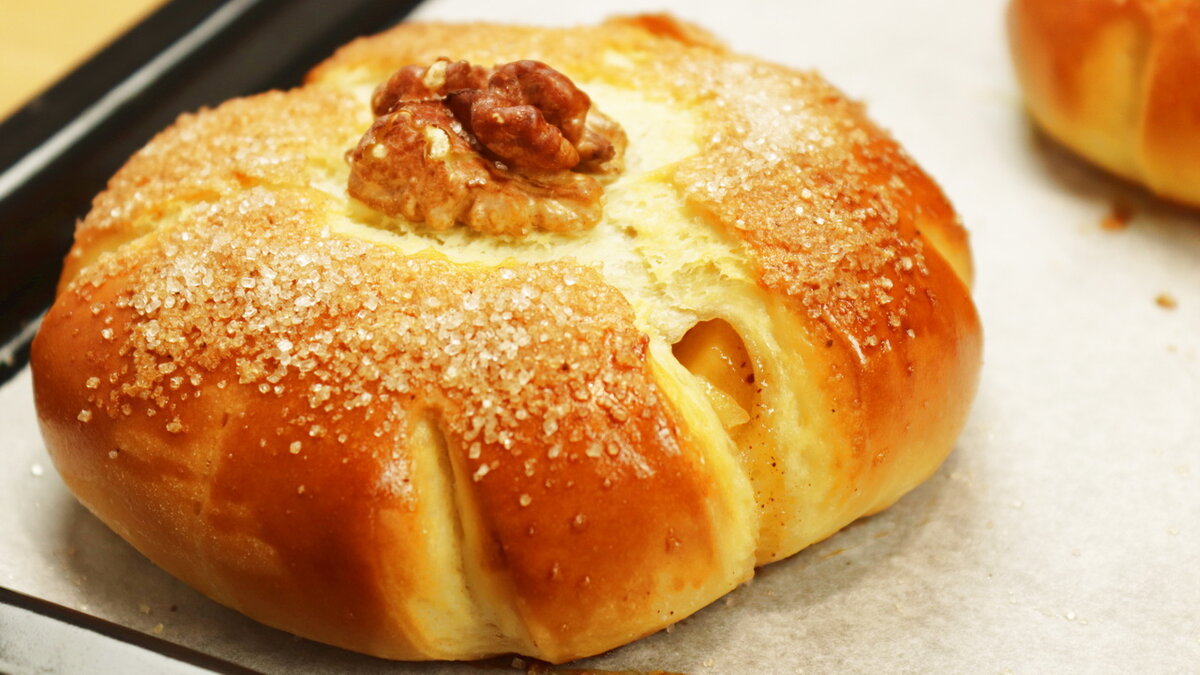 Перед выпечкой смазать яйцом, в центр поместить половинку ореха и посыпать сахаром с корицей. Выпекать в разогретой до 200 °С духовке в течение 17-20 минут. Эти булочки не только порадуют глаз, но и подарят вкусное наслаждение!