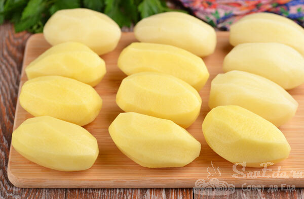 Этот вариант порадует любителей ярких вкусов. Для приготовления возьмите девять картофелин среднего размера. Можно очистить их, или оставлять кожуру, если она чистая. Разрежьте картофель пополам, а затем каждую половину разделите на три части.