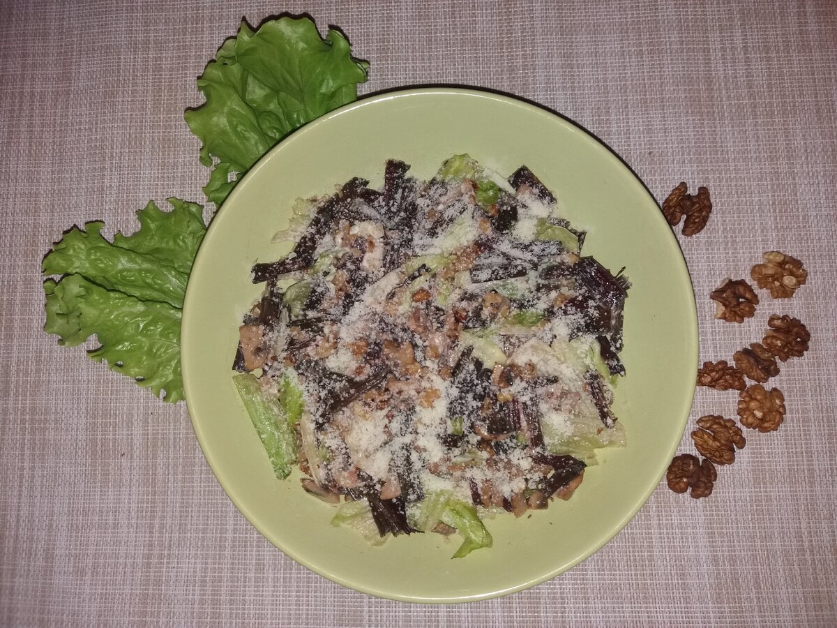 Теперь важно аккуратно соединить все ингредиенты в большой миске: подготовленные мангольд, грибы, орехи и салат. Добавляем оливковый майонез и снова перемешиваем все компоненты.