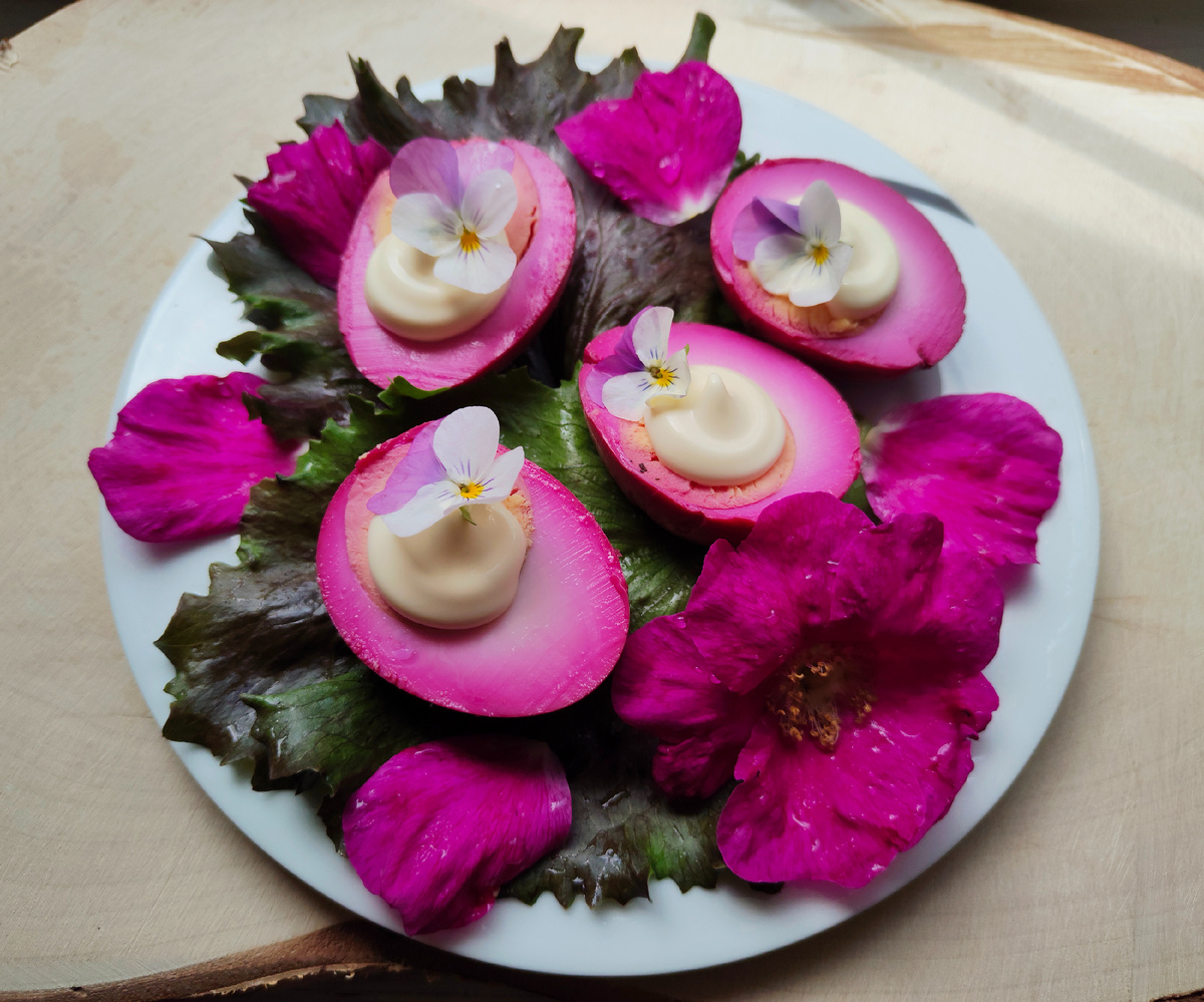 Для подачи разрежьте яйца вдоль, добавьте немного майонеза на половинки и украсьте на свой вкус. Например, можно использовать листья салата и съедобные цветы фиалок или шиповника.
