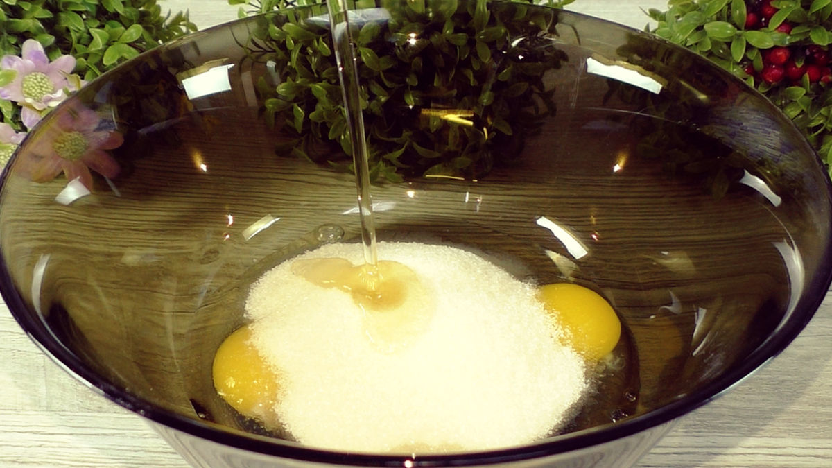 Сначала в глубокой миске смешать яйца, сахар и щепотку соли. Затем добавить растительное масло и по желанию ванильный сахар для аромата.