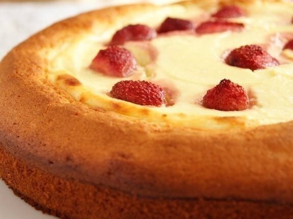 4. Поместить форму в неразогретую духовку и выпекать при температуре 180°C в течение 30-35 минут. Готовый пирог остудить немного в форме: творожная начинка осядет, а бисквитное тесто поднимется, образуя аппетитные бортики.