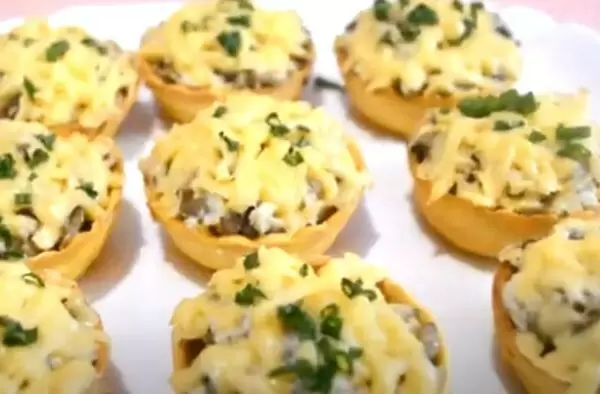 - Заполнение тарталеток: Готовую начинку помещают в тарталетки и посыпают тёртым сыром. Запекаются тарталетки при температуре 220°C примерно 10-15 минут, пока сыр не расплавится и не подрумянится.