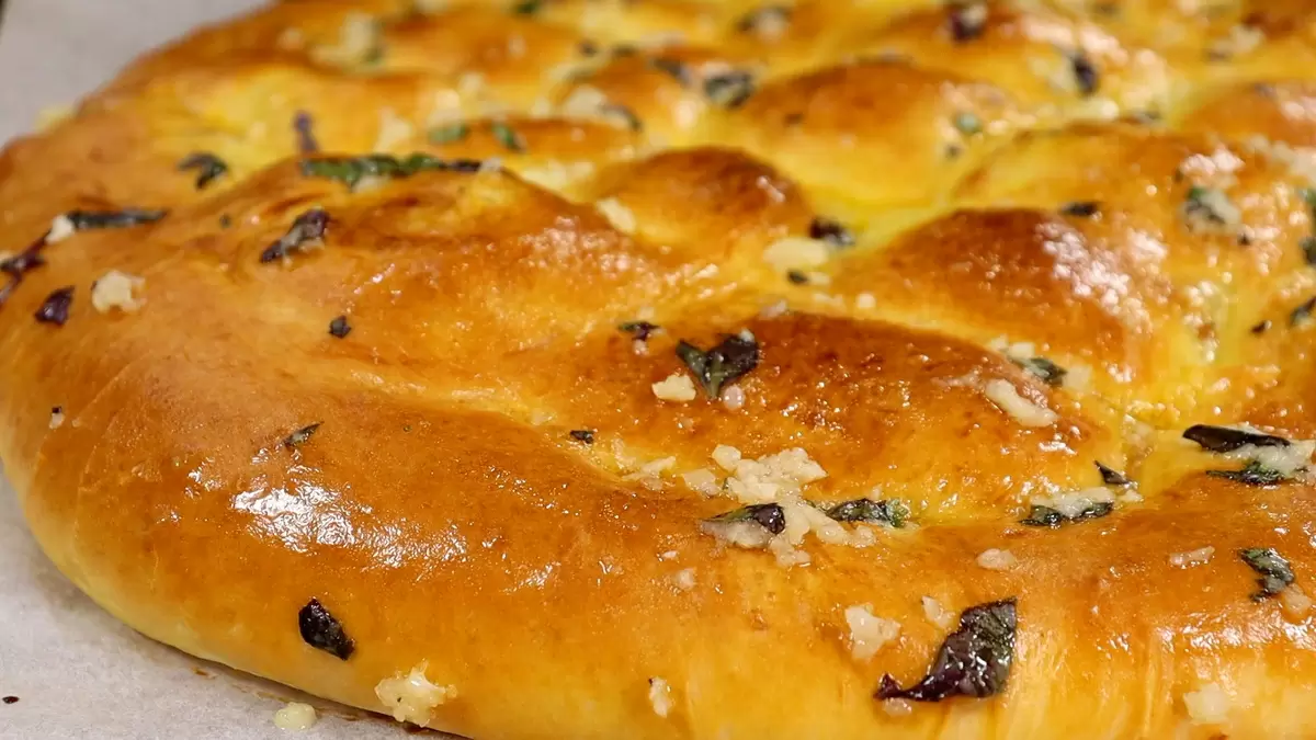 Перекладывать на противень, оставить на расстойку, смазать взбитым желтком и молоком. Выпекать в разогретой до 180°C духовке 25 минут. Для завершения намазать лепёшку чесночной смесью после выпекания, дать немного остыть, нарезать и наслаждаться!