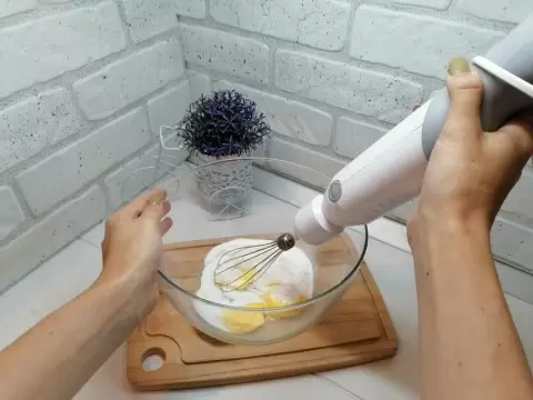 2. Поэтапно добавьте яйцо и молоко, продолжая взбивать до однородности.
