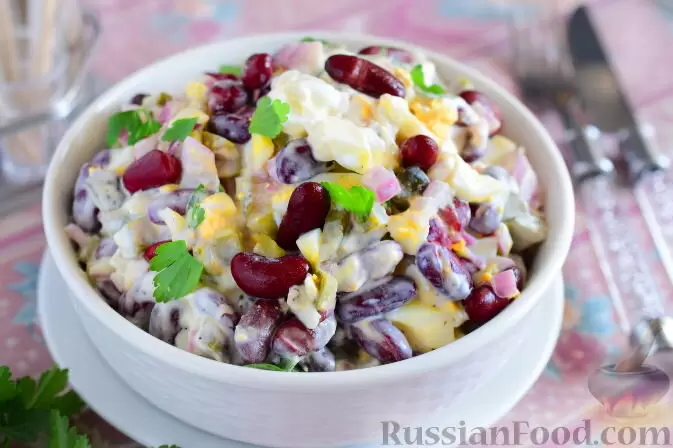 5. Салат с красной фасолью: этот салат идеально подойдёт как для плотного перекуса, так и для ужина. Состав: консервированная фасоль, красный лук, яйца, маринованные огурцы, сметана и зелень.