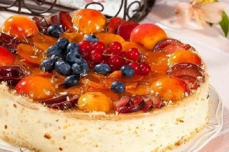 Нижний корж помещается обратно в форму, на него выкладывается крем, и накрывается вторым коржом. Остальные сливы нарезаются и располагаются сверху, а для завершения добавляются любимые фрукты и ягоды. Затем по инструкции готовится желе, которое заливается на торт. Оставить десерт в холодильнике нужно на ночь или хотя бы на 4-5 часов для застывания.
