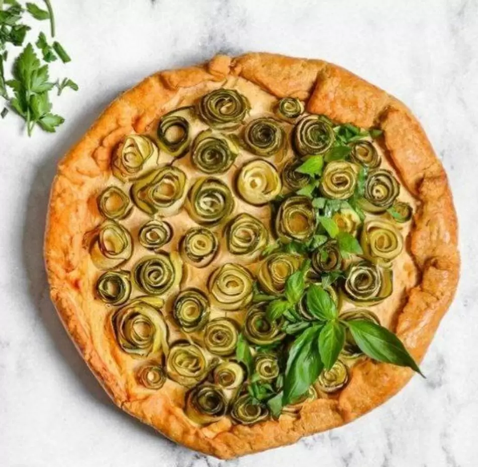 В это время тесто раскатывается в круг и выкладывается на противень, предварительно застеленный пергаментом. На дно пирога равномерно выкладывается смесь с творожным сыром, оставляя края свободными. Затем кабачковые полоски сворачиваются в рулетики и устанавливаются вертикально на дно пирога.