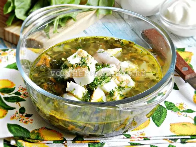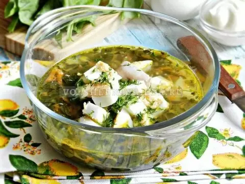 Наконец, щавель нарезают и добавляют в суп вместе с пассированными овощами и укропом. Доведите до кипения и дайте настояться 10-15 минут. На гарнир отваривают яйца, нарезают их крупными кубиками и разливают суп по тарелкам, добавляя сметану и укроп. Блюдо готово к подаче — приятного аппетита!