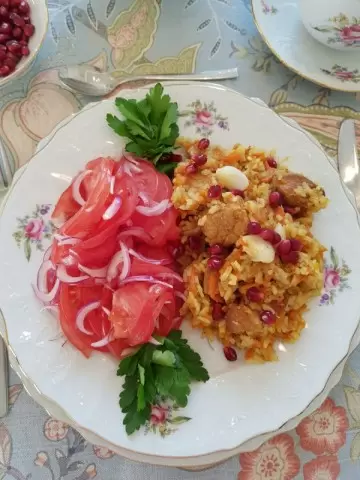 Тем временем, можно нарезать свежий салат из помидоров и лука, стараясь нарезать ингредиенты как можно тоньше. Плов подают на стол, посыпав гранатовыми зернами и украсив зубцами чеснока, что придаст блюду особый шарм.