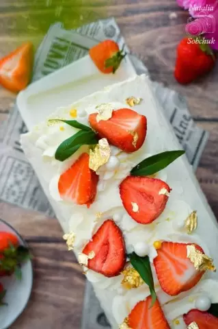 Остывший бисквит смазывается клубничным джемом и равномерно покрывается кремом. В самом конце по краям выкладываются целые ягодки клубники, что добавляет не только эффектный вид, но и изысканный вкус. Рулет следует завернуть в пергамент и оставить в холодильнике на несколько часов, чтобы он хорошо пропитался, после чего десерт можно нарезать и подавать.