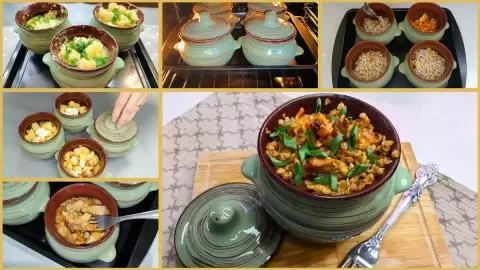 Курицу обжарить до румяной корочки, затем добавить мелко нарезанный лук и морковь. Приготовленное мясо укладывается в горшочки слоями с картофелем, посыпается специями. Полить сметаной или бульоном, запекать до готовности в духовке около 1 часа. В это время можно приготовить легкий салат из свежих овощей или свеклы.