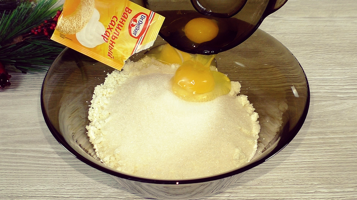 В творог добавляется обычный сахар, один пакетик ванильного сахара и три яйца. После этого без перемешивания вводим сметану и кукурузный крахмал. Все ингредиенты тщательно измельчаются с помощью погружного блендера. Начинка готова!