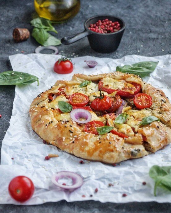 Овощи поливаются оливковым маслом, края теста смазываются желтком и посыпаются кунжутом, после чего галета отправляется в разогретую до 180°C духовку на 35 минут для получения золотистой корочки.