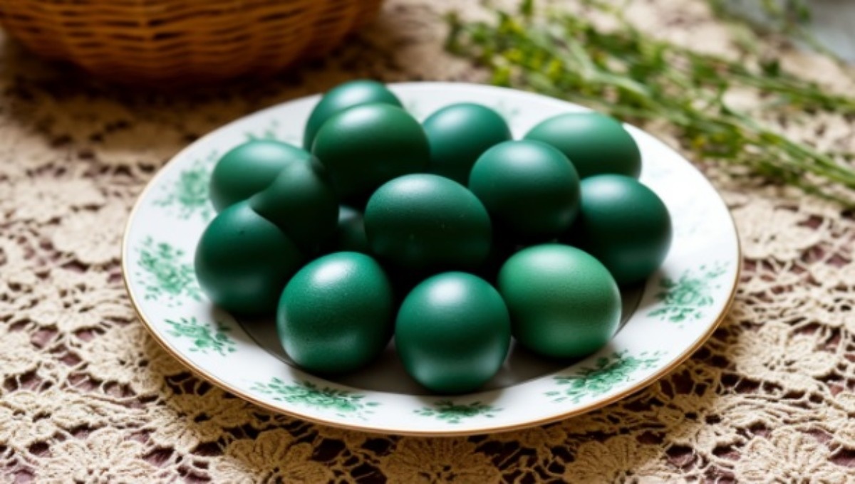 Одним из наиболее эффектных вариантов являются яйца цвета сочной весенней листвы. Они придают праздничному столу натуральный и в то же время элегантный вид, а процесс их окраски прост, хоть и требует терпения.